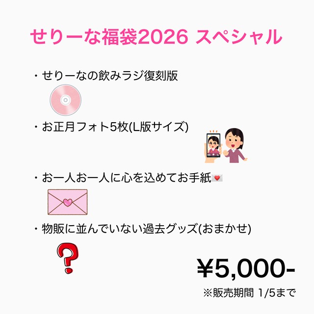 今年もやってきた♡せりーな福袋2026 ・せりーなの飲みラジ復刻版 ・お正月フォト5枚(L版サイズ) ・お一人お一人に心を込めてお手紙♥ ・物販に並んでいない過去グッズ(おまかせ) ¥5,000- ※販売期間 1/5まで 出来次第、順次発送。